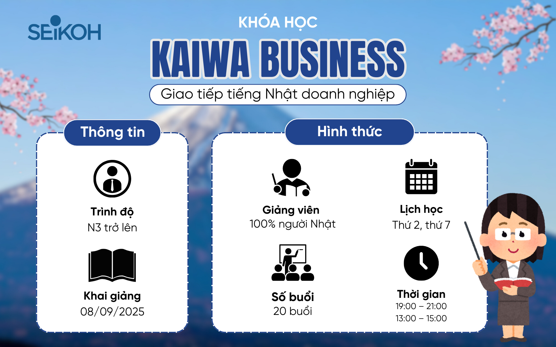 Ngày 08/09/2025, Trung tâm tiếng Nhật SEIKOH khai giảng khóa học giao tiếp tiếng Nhật doanh nghiệp Kaiwa Business dành cho học viên từ trình độ N3 trở lên. Lộ trình tinh gọn, tối ưu, thực tiễn với 100% giảng viên người Nhật, khóa học chính là chìa khóa giúp doanh nghiệp tạo dựng lợi thế cạnh tranh bền vững.