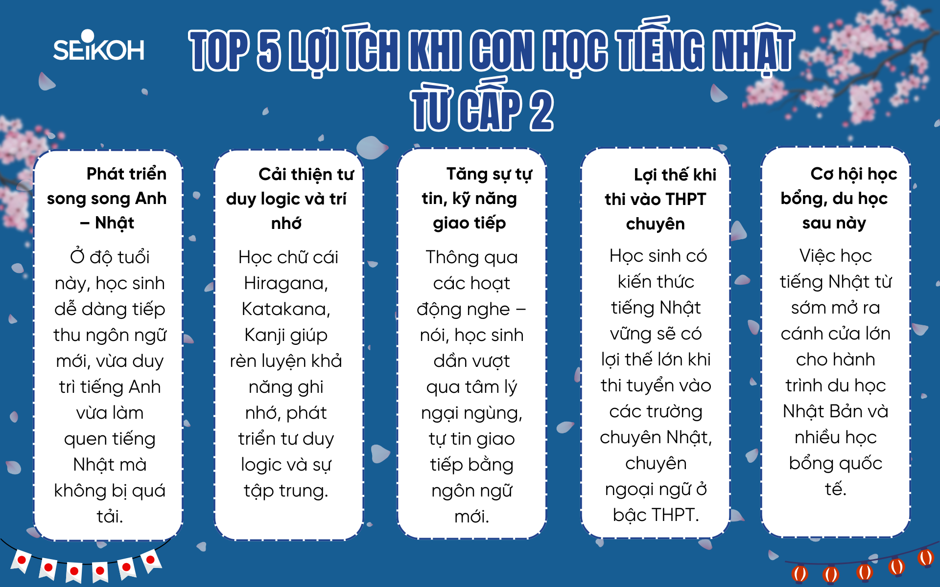 Dưới đây là Top 5 lợi ích nổi bật khi học sinh bắt đầu học tiếng Nhật từ cấp 2 – được tổng hợp và phân tích bởi Trung tâm tiếng Nhật SEIKOH Hà Nội.
